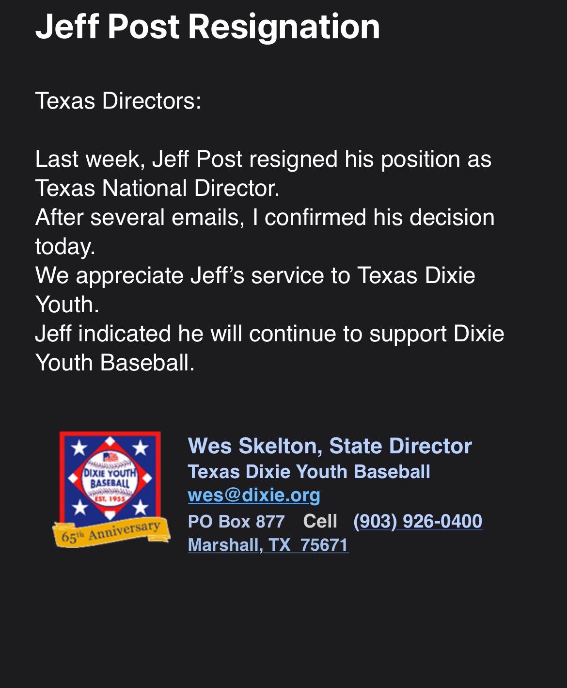I find that after information obtained today, my time on the Texas Dixie Youth Board has come to an end. Effectively immediately I will no longer perform the duties as set forth in the Texas or National Bylaws. I wish the best for each of you and the organization.