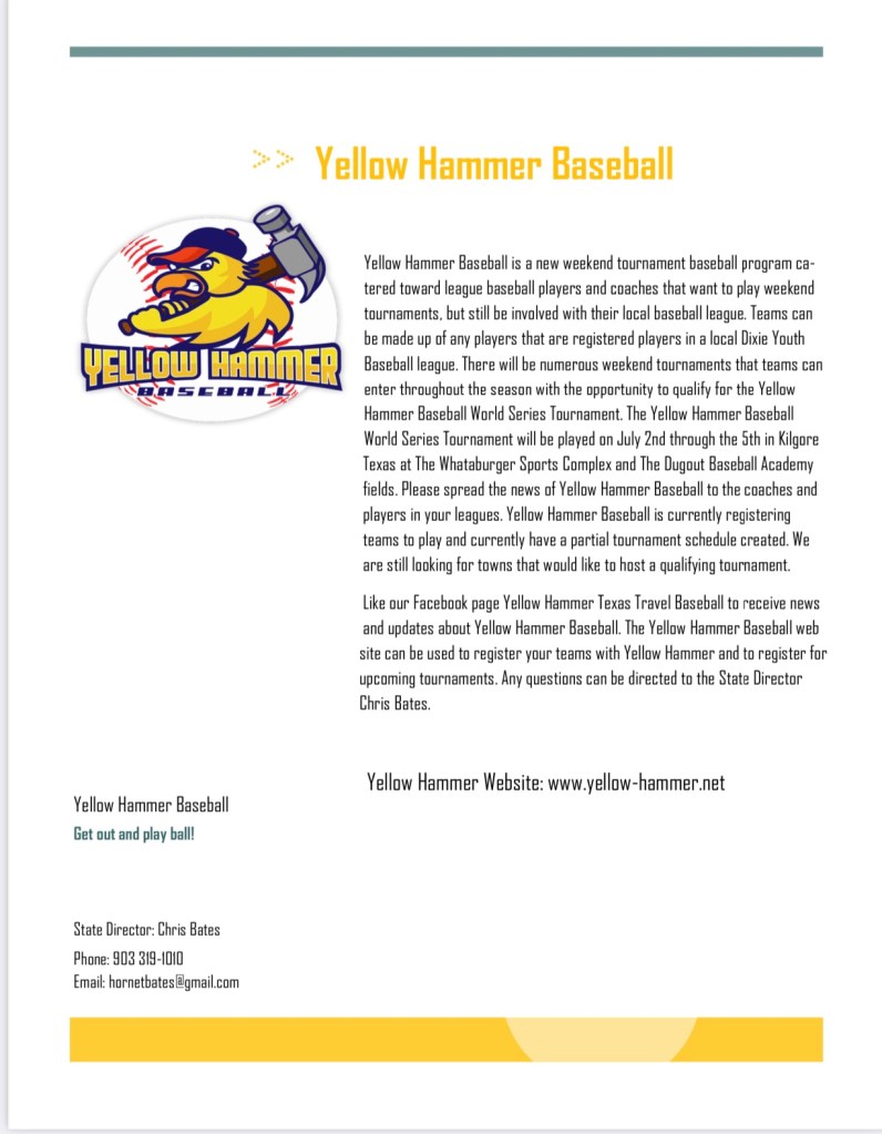 Leagues Officials and Coaches – Contact the State Director, Chris Bates @ 903-319-1010 or hornetbates@gmail.com to discuss hosting a tournament and registration of a team. Visit http://www.yellow-hammer.net to look at the tournament calendar and download the rules.
